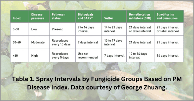 One of the most useful disease forecast tools for grape growers is the Powdery Mildew Index (PMI). tinyurl.com/5etdb6v2. This index tracks the duration of canopy temperature between 70° F and 85° F after budbreak, ranging from 0 to 100. Higher numbers indicate a higher PM risk, necessitating a higher fungicide rate based on the label and shorter spray intervals when disease pressure is high. Guidelines on PM disease pressure corresponding to fungicide types and spray intervals are illustrated in Table 1.
